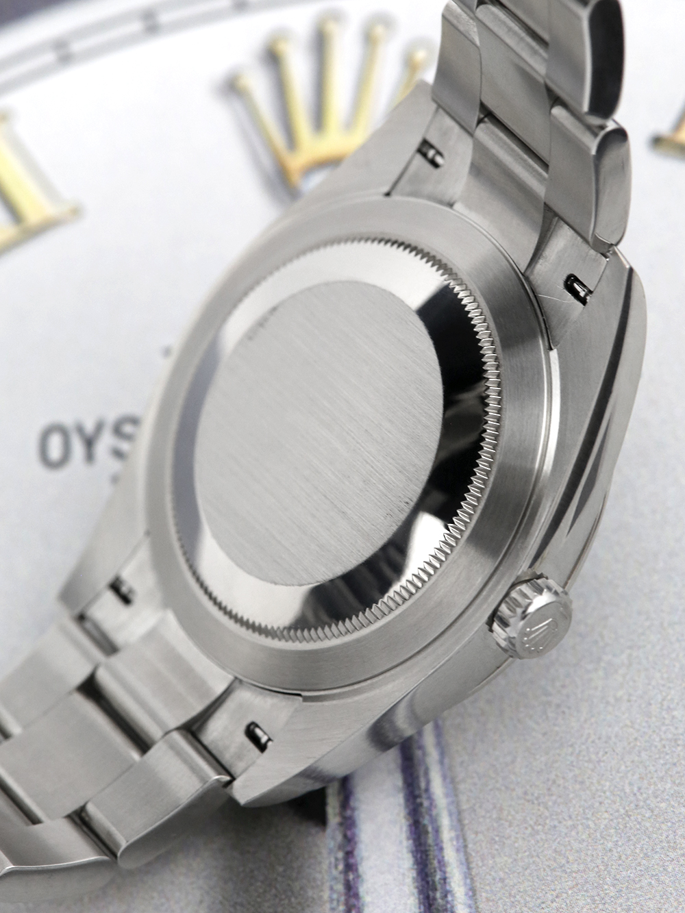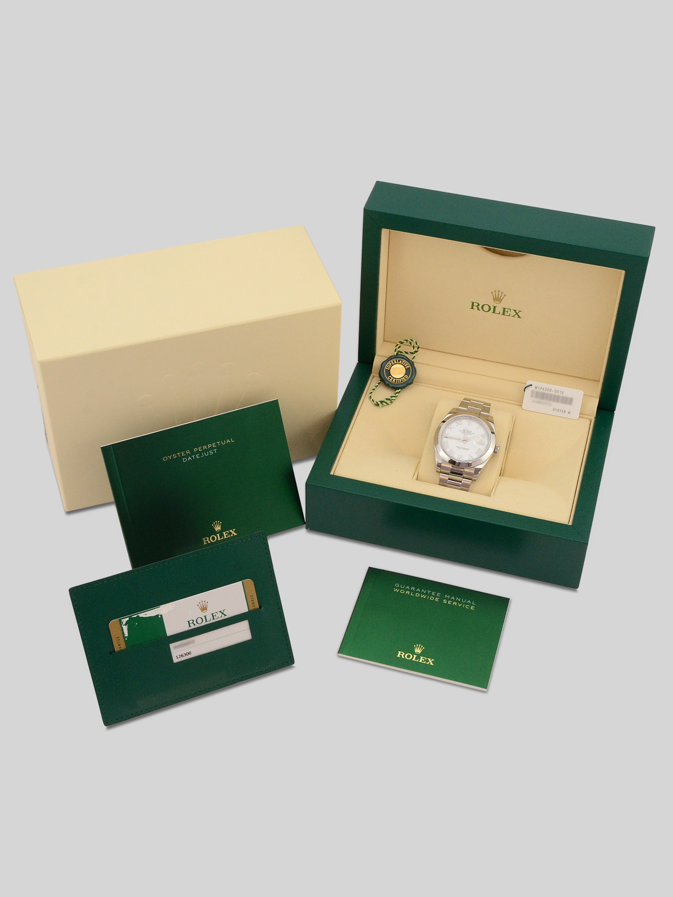 This particular watch is supplied as shown in the detailed images with the outer box sleeve, both of the original inner and outer Rolex boxes, the two original Rolex manuals, the two original Rolex swing tags, the original Rolex warranty card holder, and the original Rolex warranty card. The card is dated July 2019 when first supplied new.