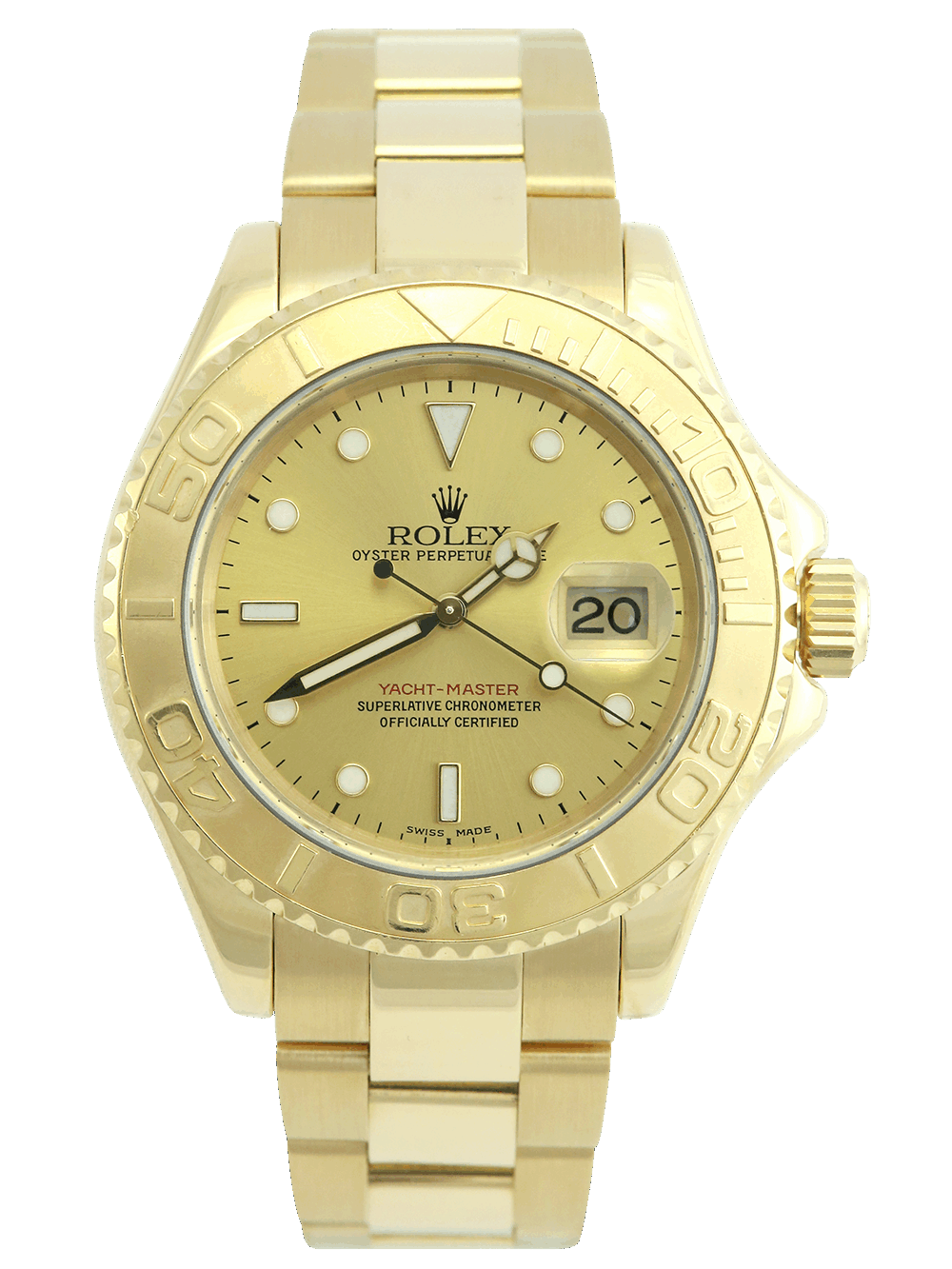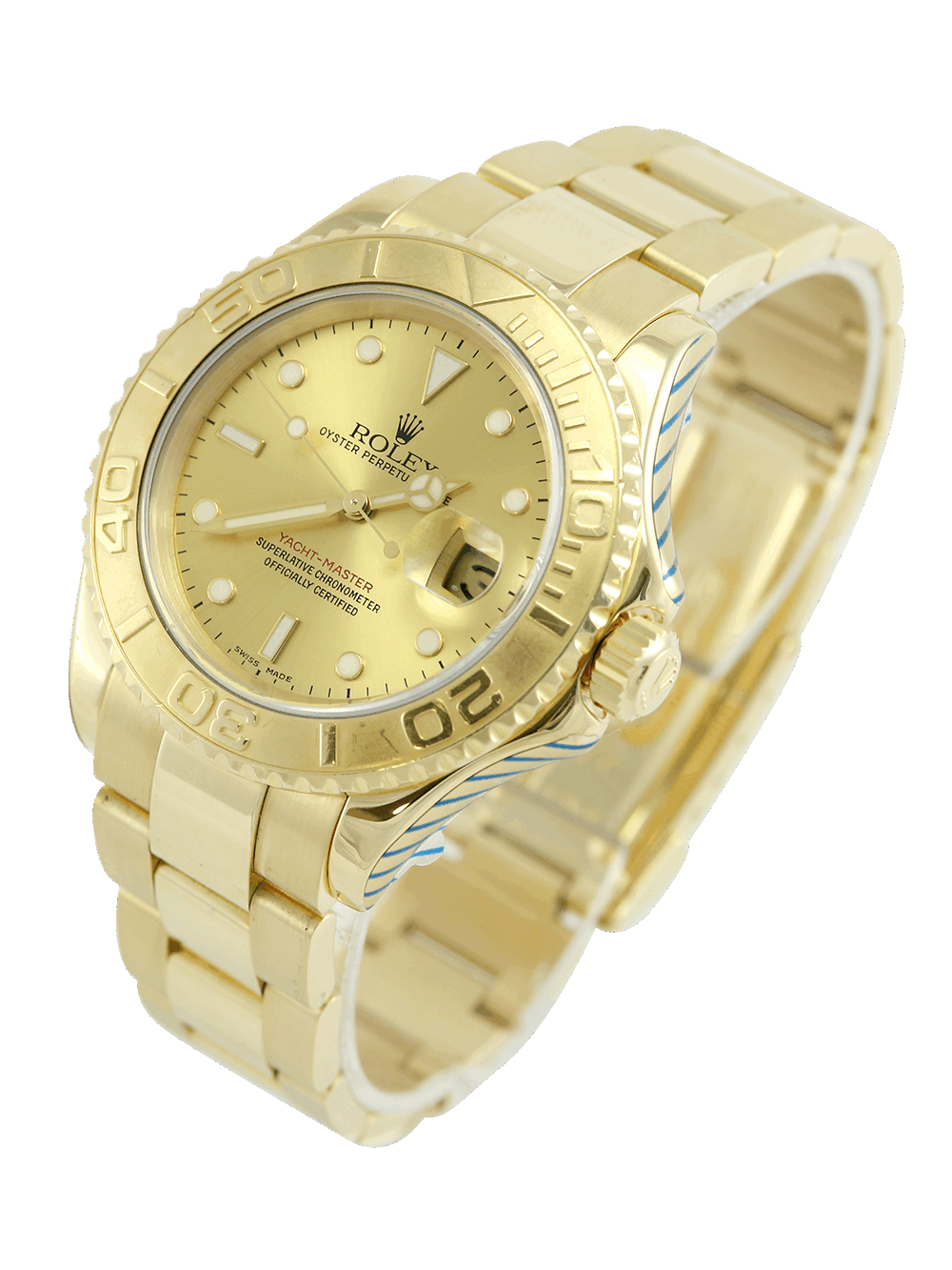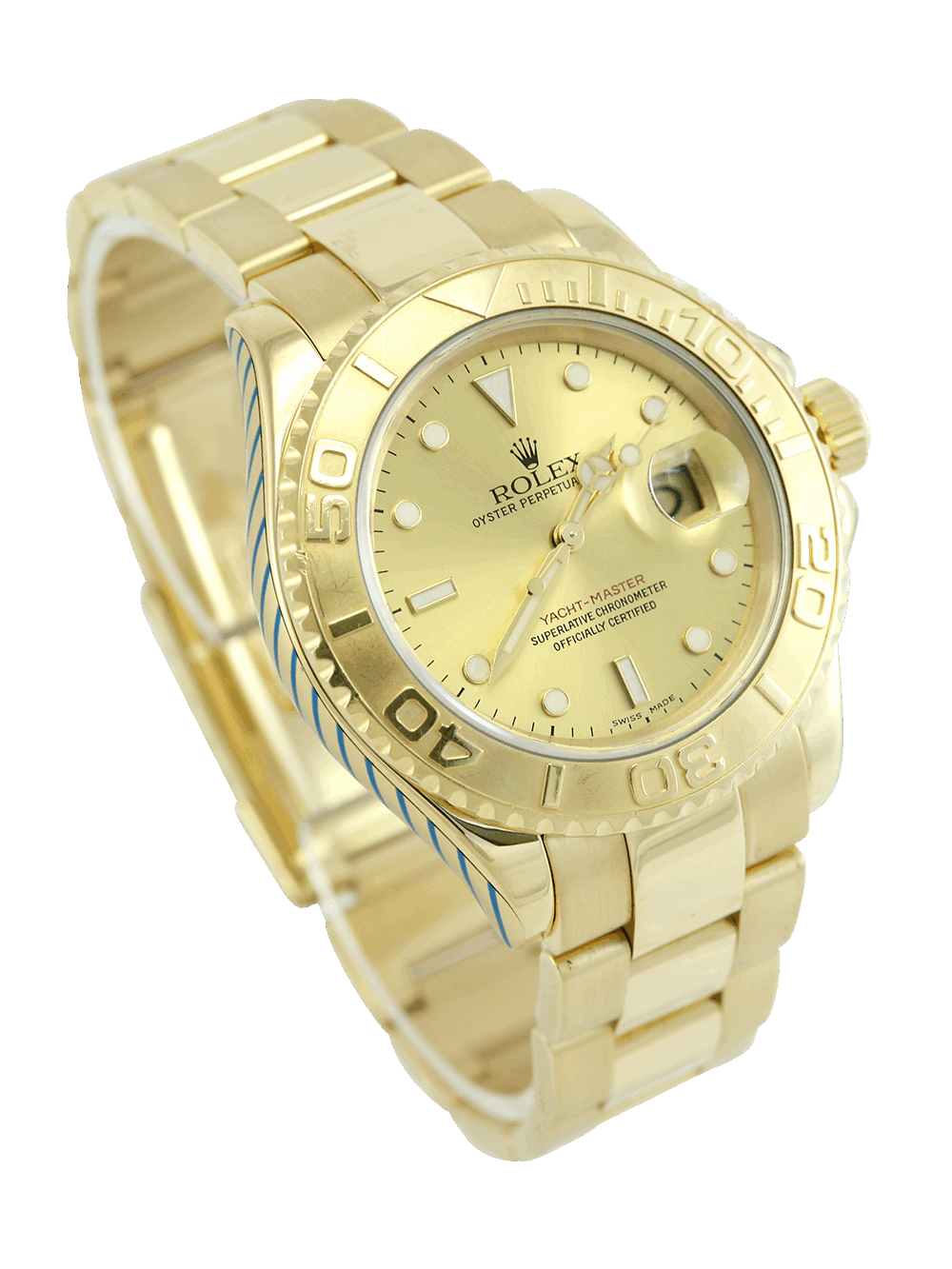 An excellent condition pre-owned yellow gold chronometer certified automatic movement 40mm case size Rolex Yacht-Master 40 model reference 16628 featuring a champagne baton dial surrounded by a yellow gold sandblasted bezel with polished finish numerals on a full retail length yellow gold Rolex Oyster bracelet.