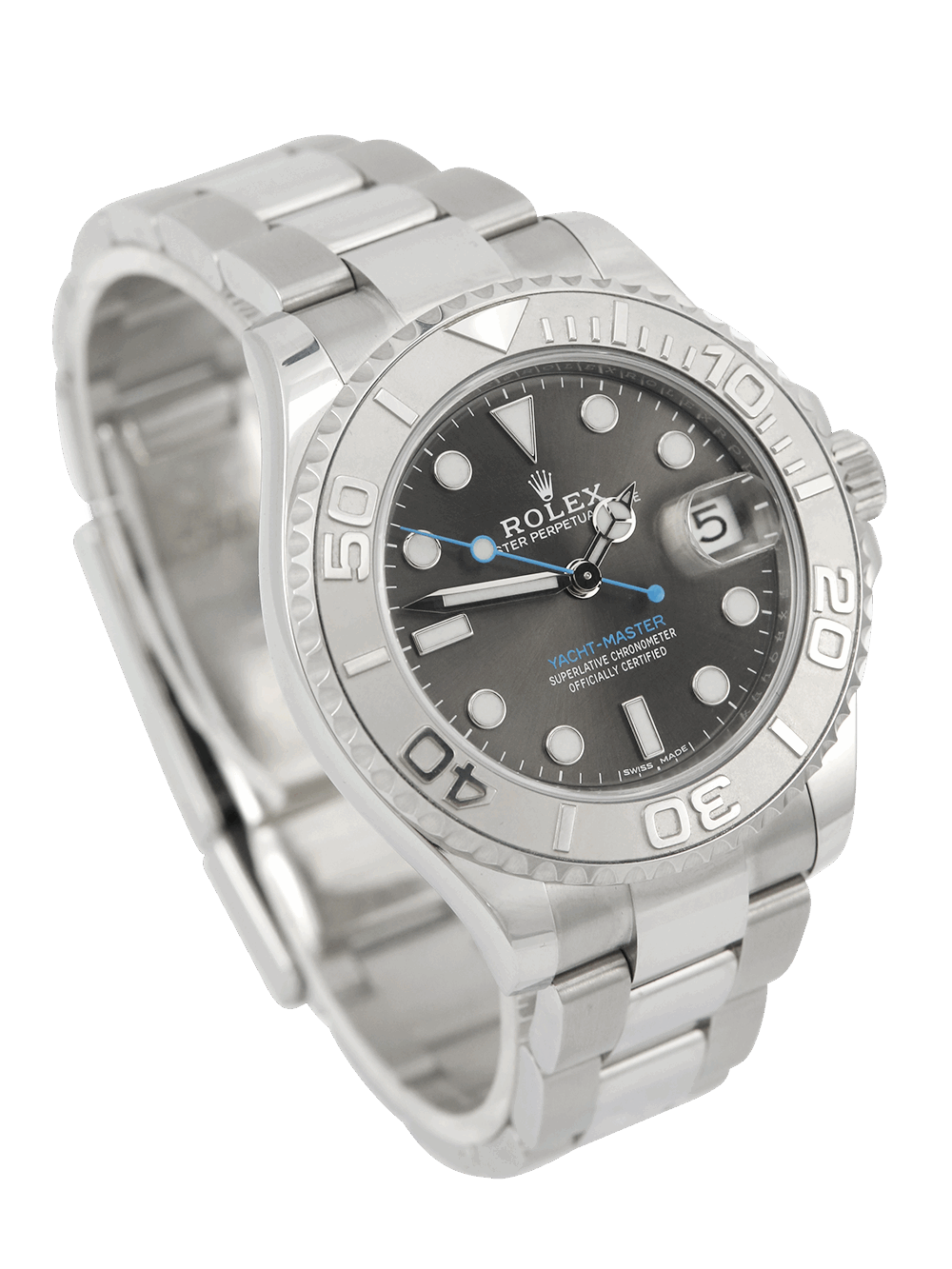 We are pleased to offer for sale this brand new unworn 37mm case size Oystersteel superlative chronometer, calibre 2236, automatic movement Rolex Yacht-Master 37 model reference 268622 featuring a slate baton dial housing a date aperture at 3 O’clock surrounded by a bidirectional Platinum 60-minute bezel on a full retail length Oystersteel Rolex Oyster bracelet.