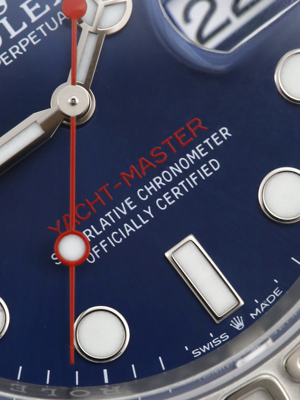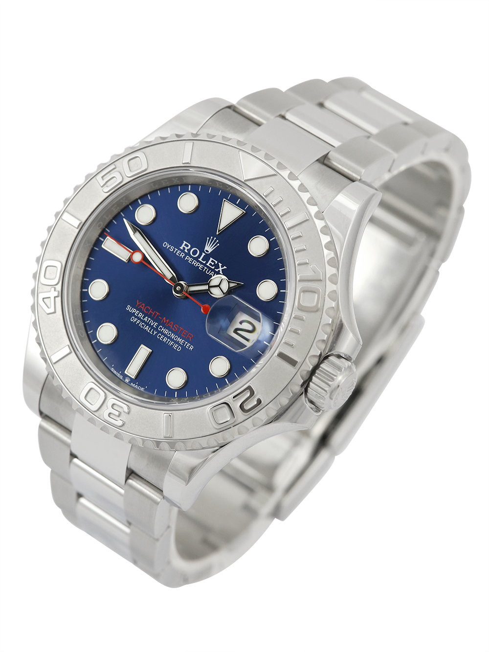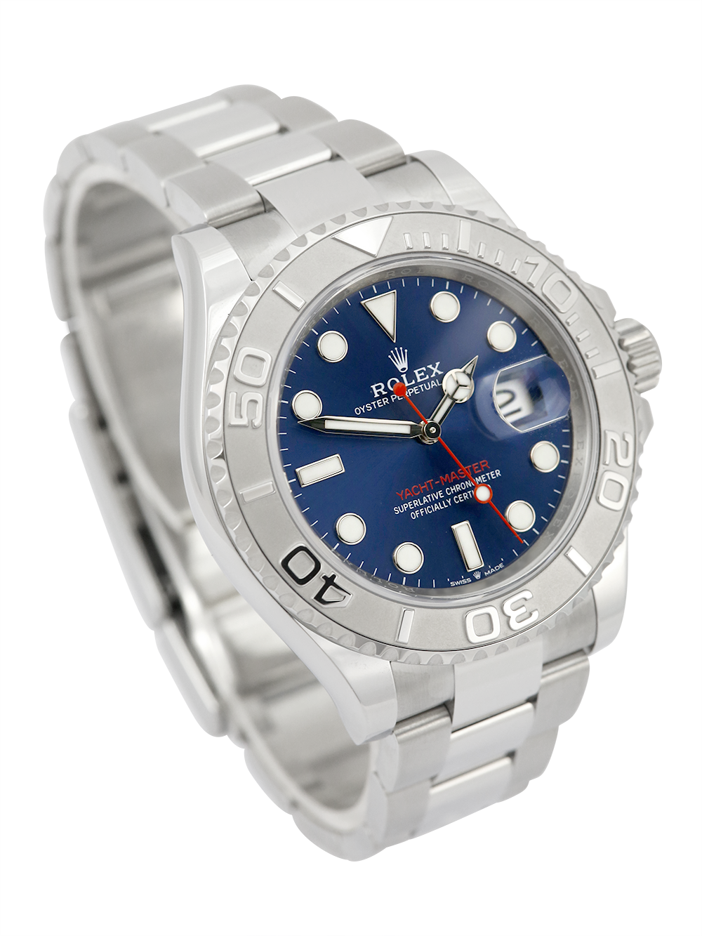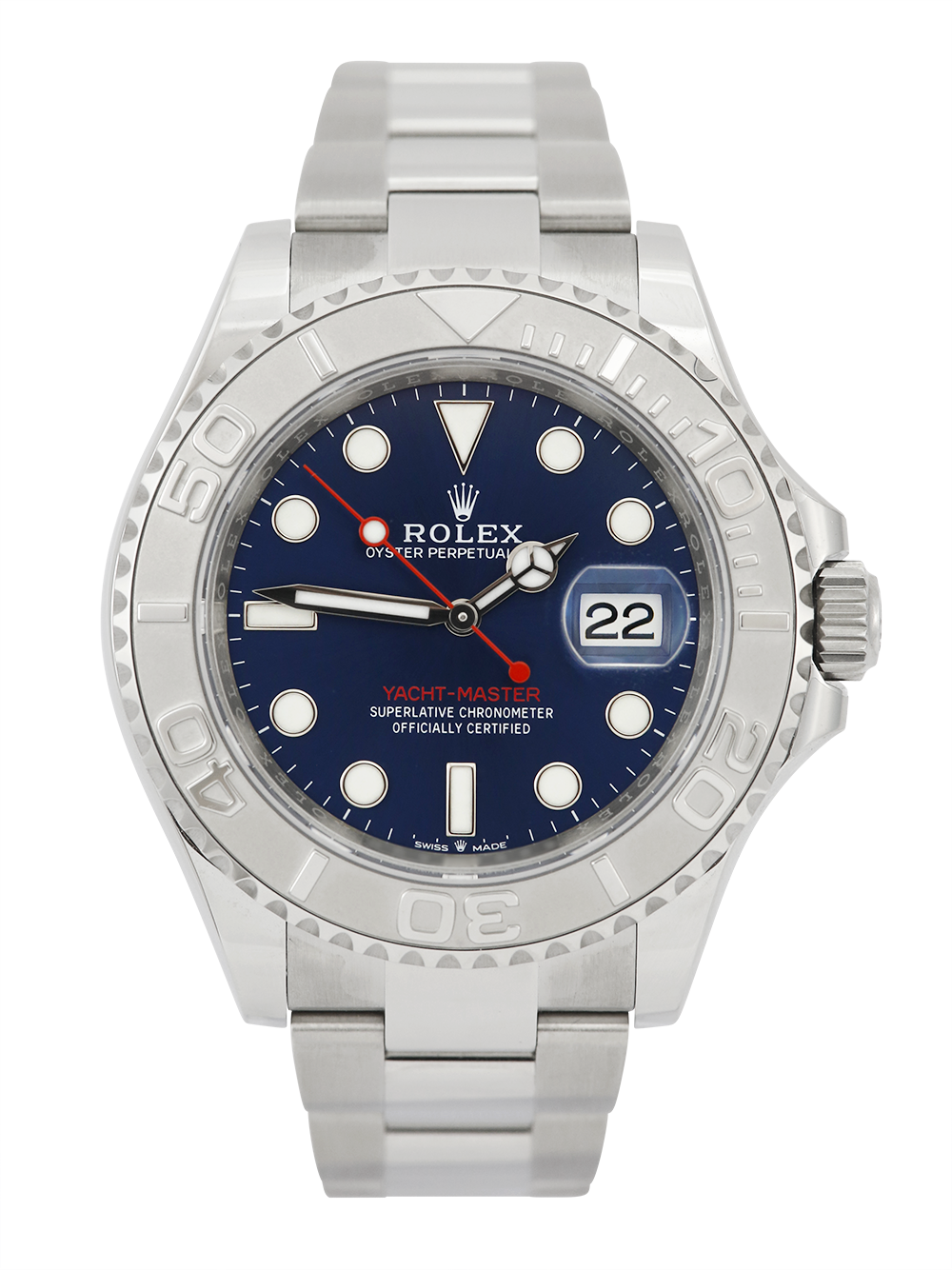 A brand new, unworn chronometer certified, automatic movement Rolex Yacht-Master, model reference 126622. Featuring a 40mm stainless steel case, housing a blue dial with a date aperture at 3 o’clock and an external cyclops. The dial is surrounded by a sandblasted platinum 60-minute rotating bezel with polished finish numerals. Presented on a full retail length stainless steel Rolex Oyster bracelet.