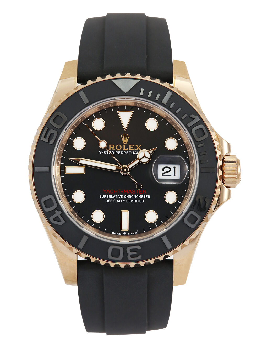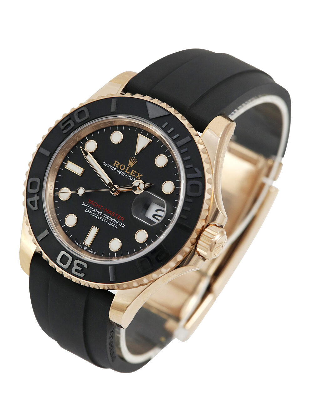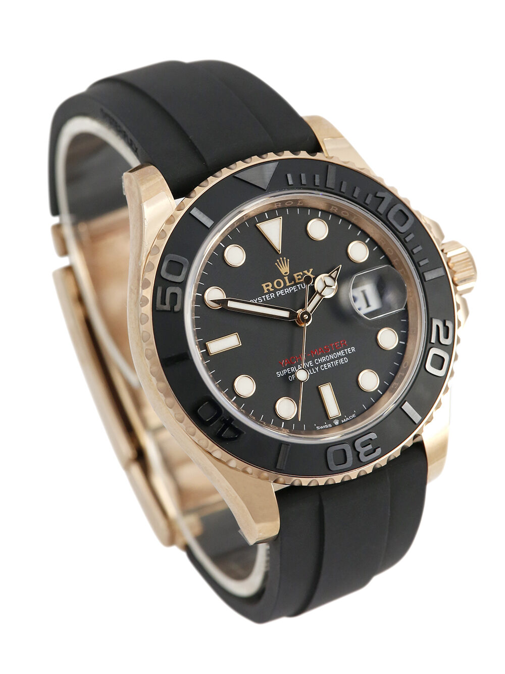 An unworn with some factory stickers still intact and untampered 40mm case size everose gold superlative chronometer, calibre 3235, automatic movement Rolex Yacht-Master 40 model reference 126655 featuring a black baton dial housing a date aperture at 3 O’clock with an external cyclops surrounded by a black ceramic 60-minute bezel presented on a black Rolex Oysterflex size F & E deployment strap with a glide lock everose gold clasp.