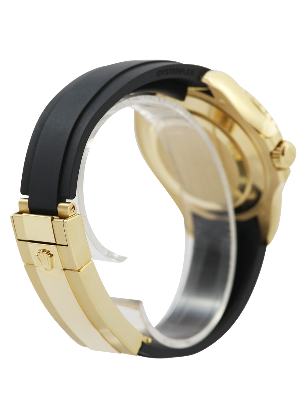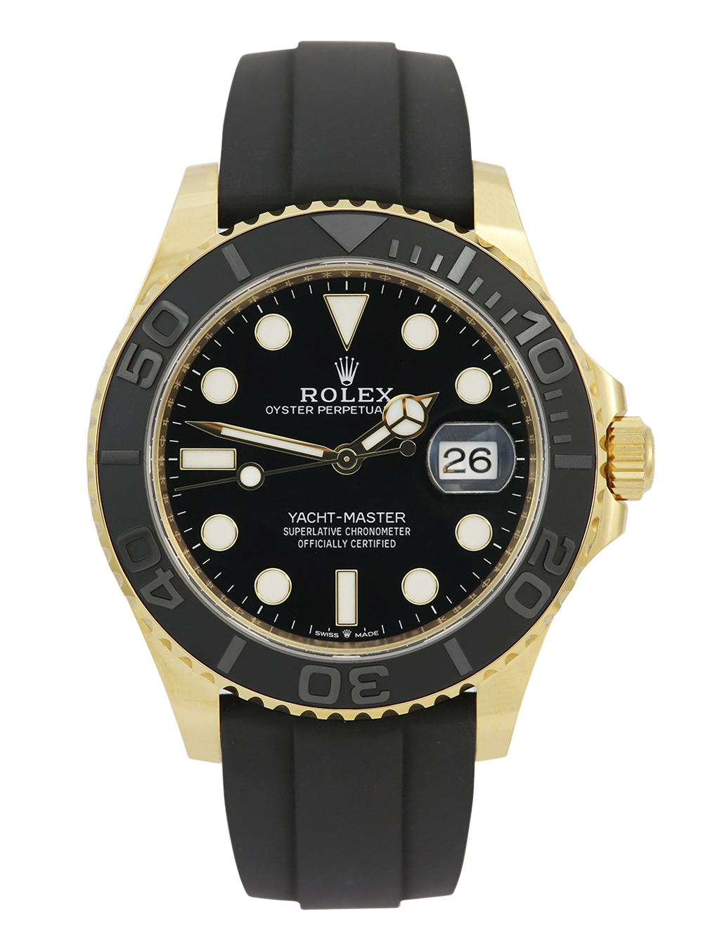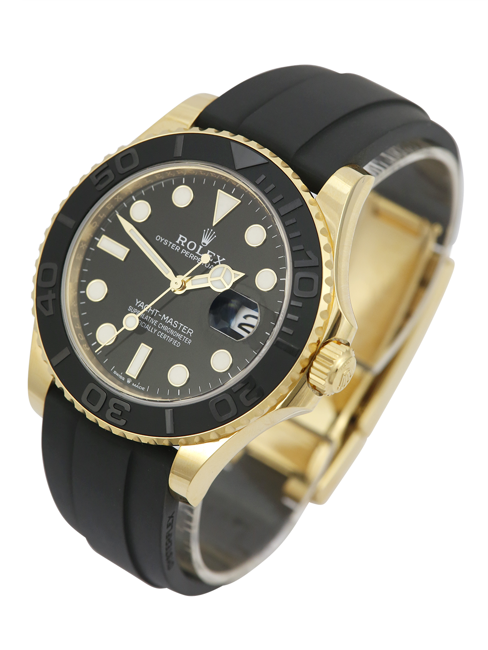 An excellent condition pre-owned 42mm case size yellow gold superlative chronometer, calibre 3235, automatic movement Rolex Yacht-Master 42 model reference 226658 featuring a black baton dial housing a date aperture at 3 O’clock with an external Cyclops surrounded by a yellow gold and black ceramic 60-minute bezel on a black Rolex Oysterflex bracelet (Size F & F).