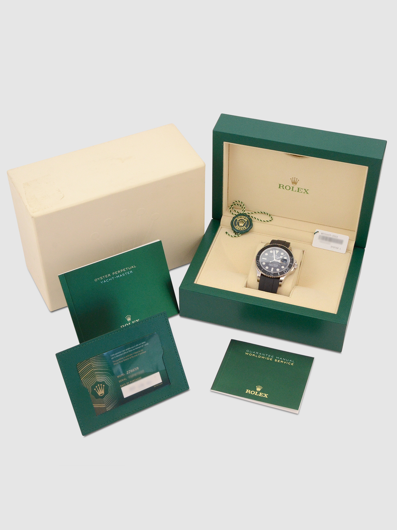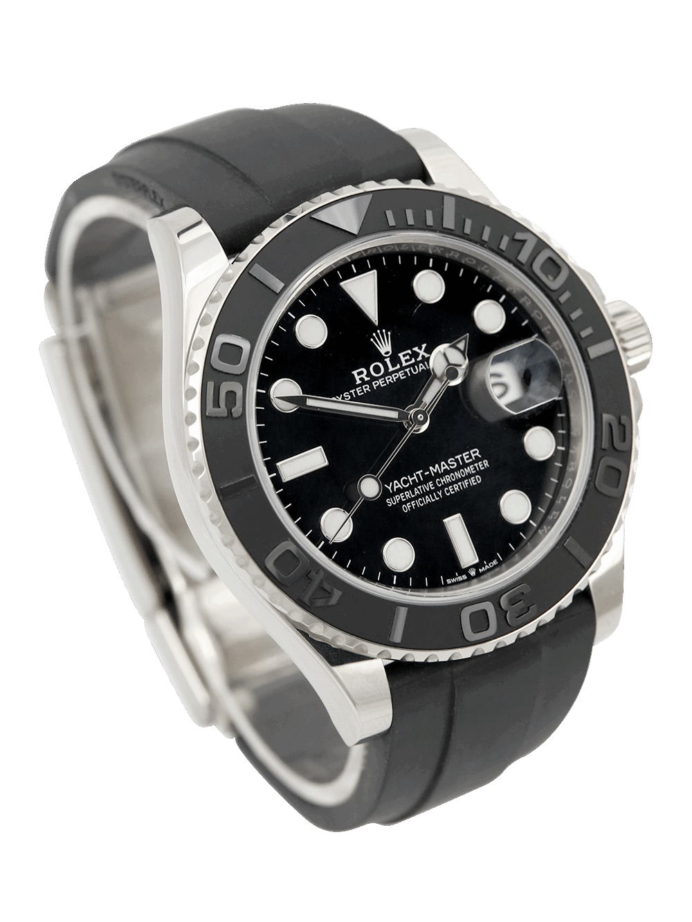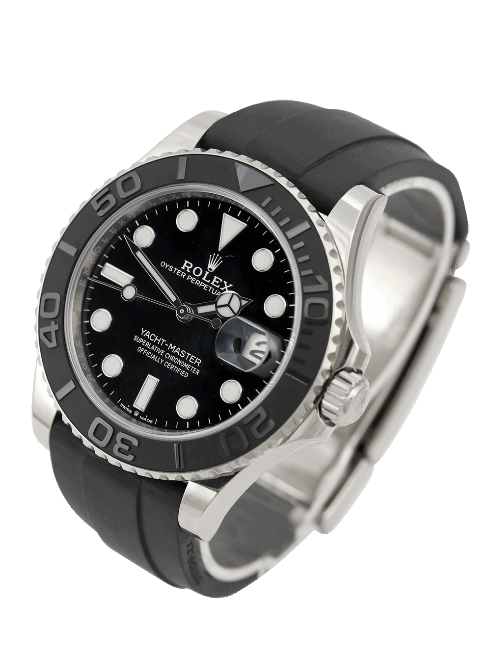 An excellent condition pre-owned 42mm case size white gold Superlative Chronometer, calibre 3235, automatic movement Rolex Yacht-Master 42 226659 featuring a black baton dial housing a date aperture at 3 O’clock surrounded by a white gold bidirectional bezel with black ceramic 60-minute insert. This particular watch comes on a black Rolex Oysterflex bracelet Size E & E.
