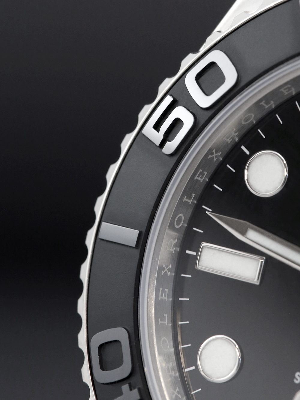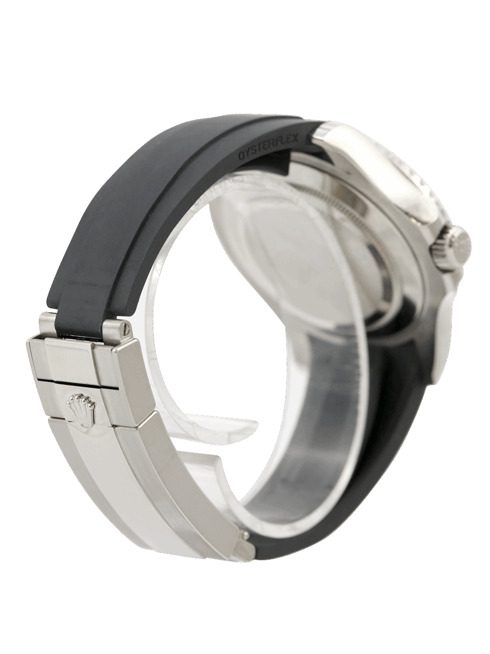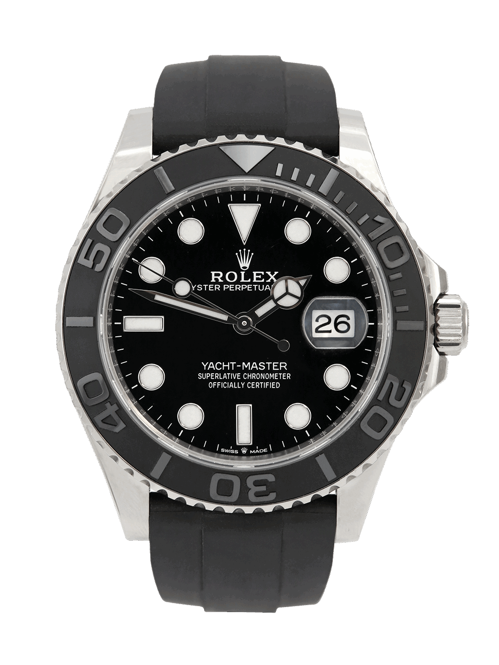 An excellent condition pre-owned 42mm case size white gold Superlative Chronometer, calibre 3235, automatic movement Rolex Yacht-Master 42 226659 featuring a black baton dial housing a date aperture at 3 O’clock surrounded by a white gold bidirectional bezel with black ceramic 60-minute insert. This particular watch comes on a black Rolex Oysterflex bracelet Size E & E.