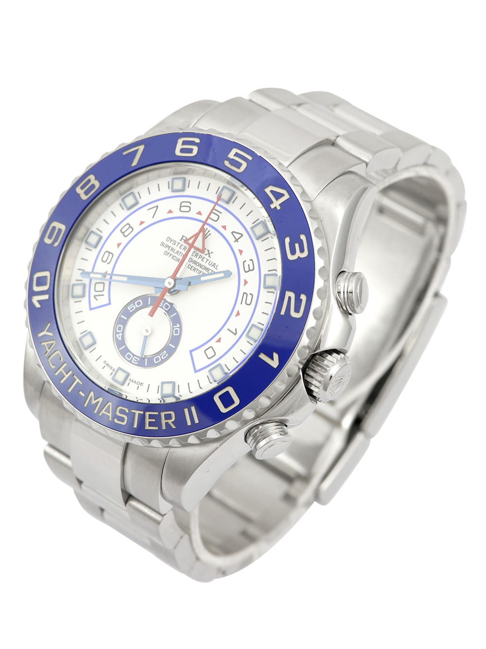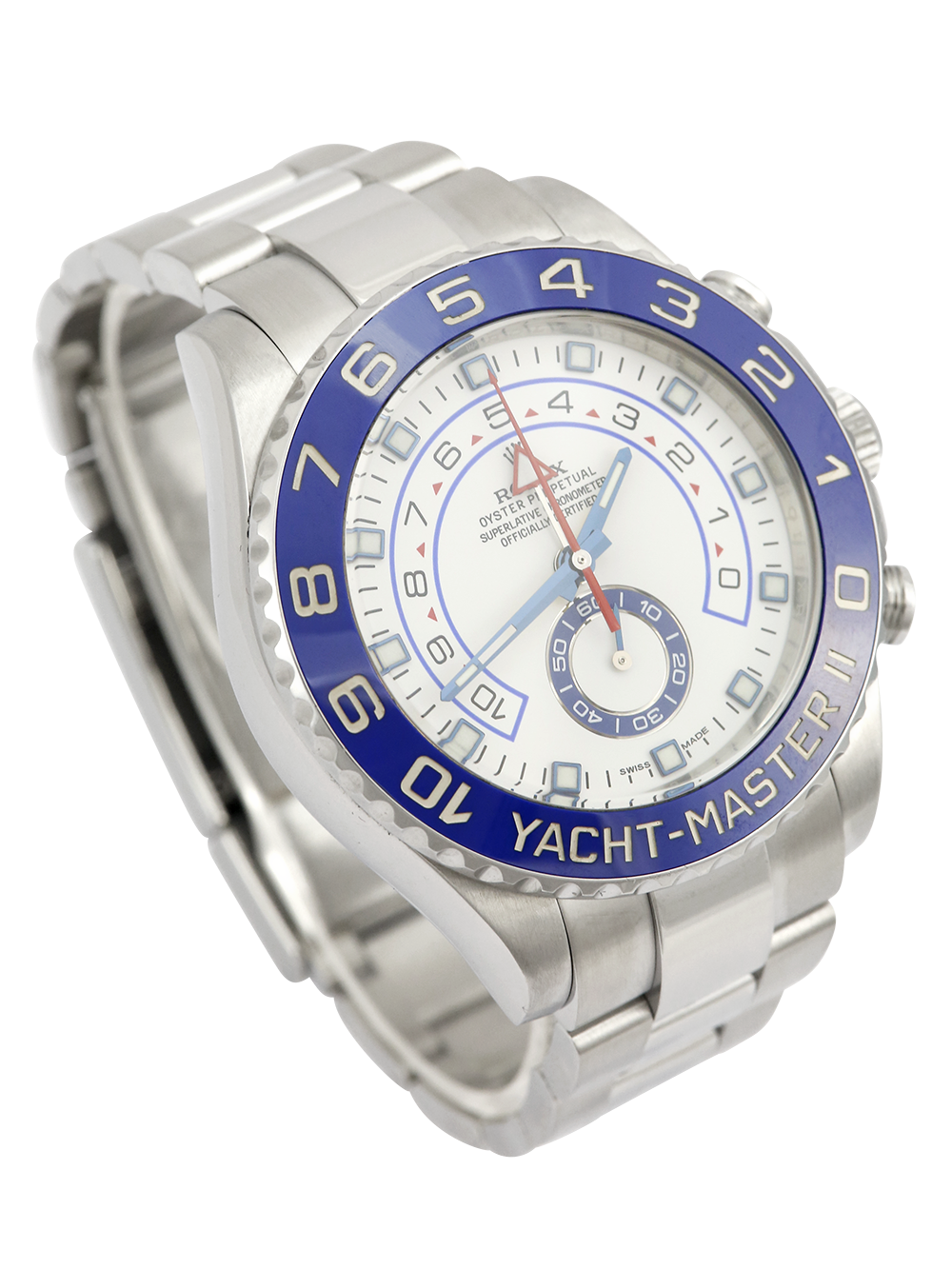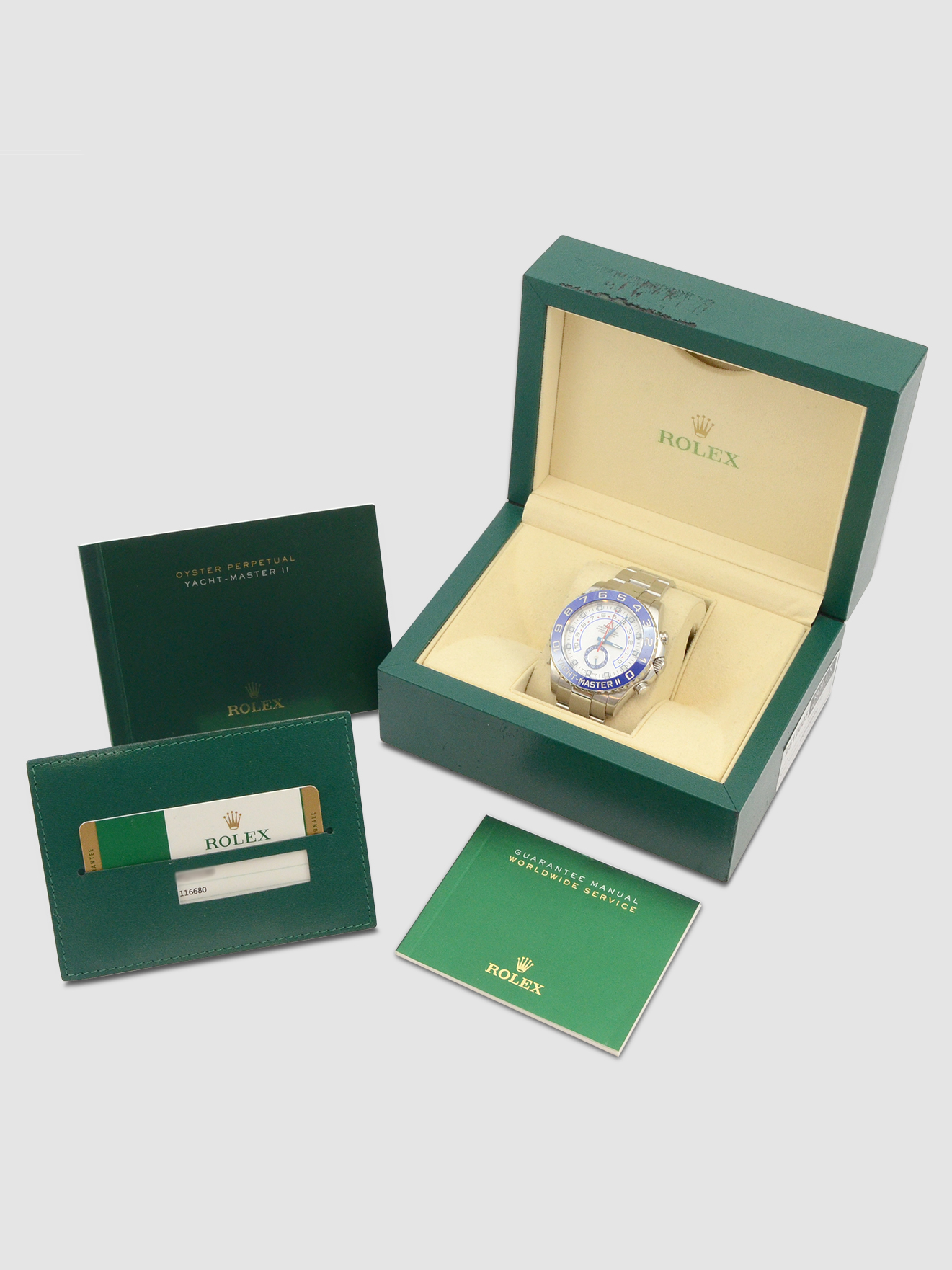 We are pleased to offer for sale this previously owned Rolex Yacht-Master II which is presented in excellent condition model reference 116680. Featuring a 44mm stainless steel case, housing a white baton dial with a regatta chronograph function, small seconds sub-dial and a red chronograph hand. The dial is surrounded by a 10 minute countdown blue ceramic bezel. All presented on a stainless steel Rolex Oyster bracelet with a secure Oysterlock folding clasp.