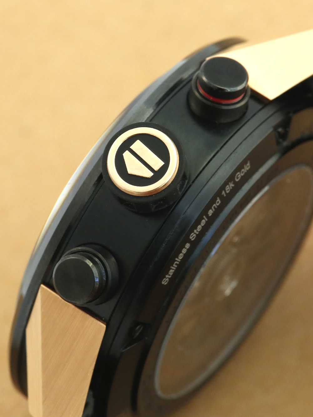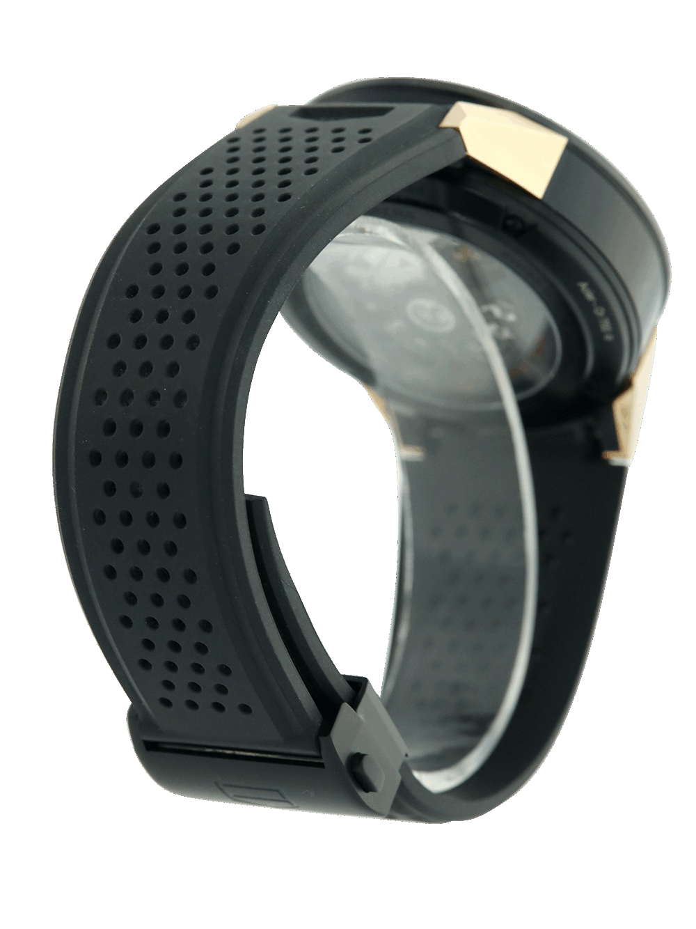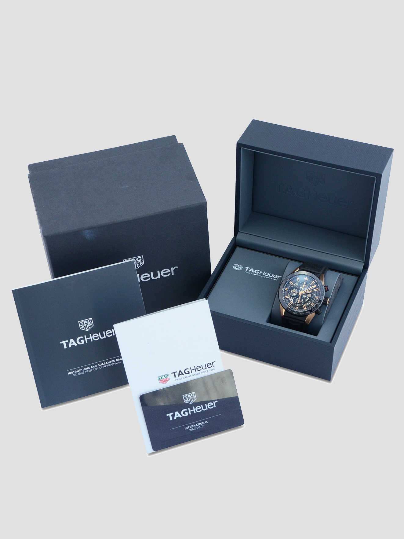 A preowned rose gold, with PVD steel case middle, 43mm case size automatic, calibre Heuer 01, Tag Heuer Carrera Chronograph CAR205A.FT6087 featuring a black skeleton dial with three sub-dials housing a date aperture in-between 3 and 4 O’clock surrounded by a black ceramic tachymetre bezel. This particular watch comes on a black rubber deployment Tag Heuer strap.