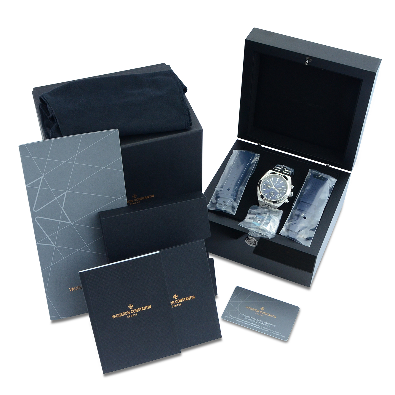 This particular watch is supplied as shown in the detailed images with the original outer box sleeve (not shown), both of the original Vacheron Constantin inner and outer boxes, the original Vacheron Constantin inner box dust cover, two brand new original Vacheron Constantin additional straps (rubber and leather), an original Vacheron Constantin warranty manual, the original Vacheron Constantin warranty card holder and the original Vacheron Constantin warranty card dated July 2023 when first supplied new.